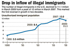 Fewer illegal immigrants came to the U.S. every year between 2007 and 2009 than in the years in the first half of the decade, the study found. About 300,000 illegal immigrants entered the U.S. each year between 2007 and 2009, a drop from the 850,000 new unauthorized immigrants that entered each year between 2000 and 2005.