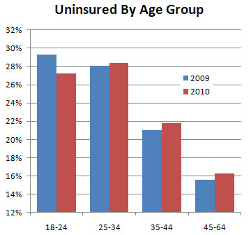 Jon Cohn points out today that the new Census Bureau report on poverty provides some pretty good evidence that Obamacare is already working. Thanks to the recession, the number of people without healthcare coverage has risen among most age