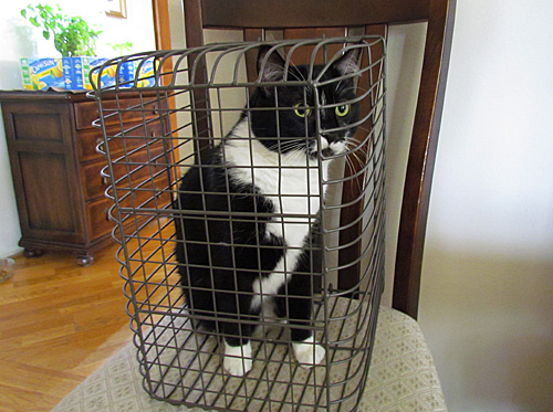 Can you guess which ones are mine and which ones are Marian’s? In the meantime, enjoy this picture of Hilbert in jail. This cage is normally used to keep Hilbert out of the plants in the background, and when it was moved for maintenance he wanted in—plants or no plants. However, he earned parole for good behavior very quickly. Lucky cat.