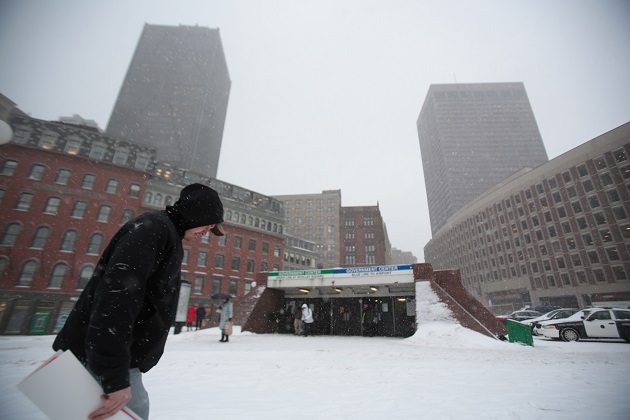 A Bostonian trudges by Government Center as Winter Storm Hercules's snows begin.Nicolaus Czarnecki/METRO US/ZUMA