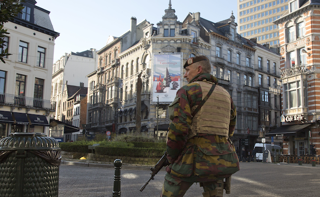 A Belgian Army soldier patrols in the Sablon District of Brussels on Monday.Virginia Mayo/AP