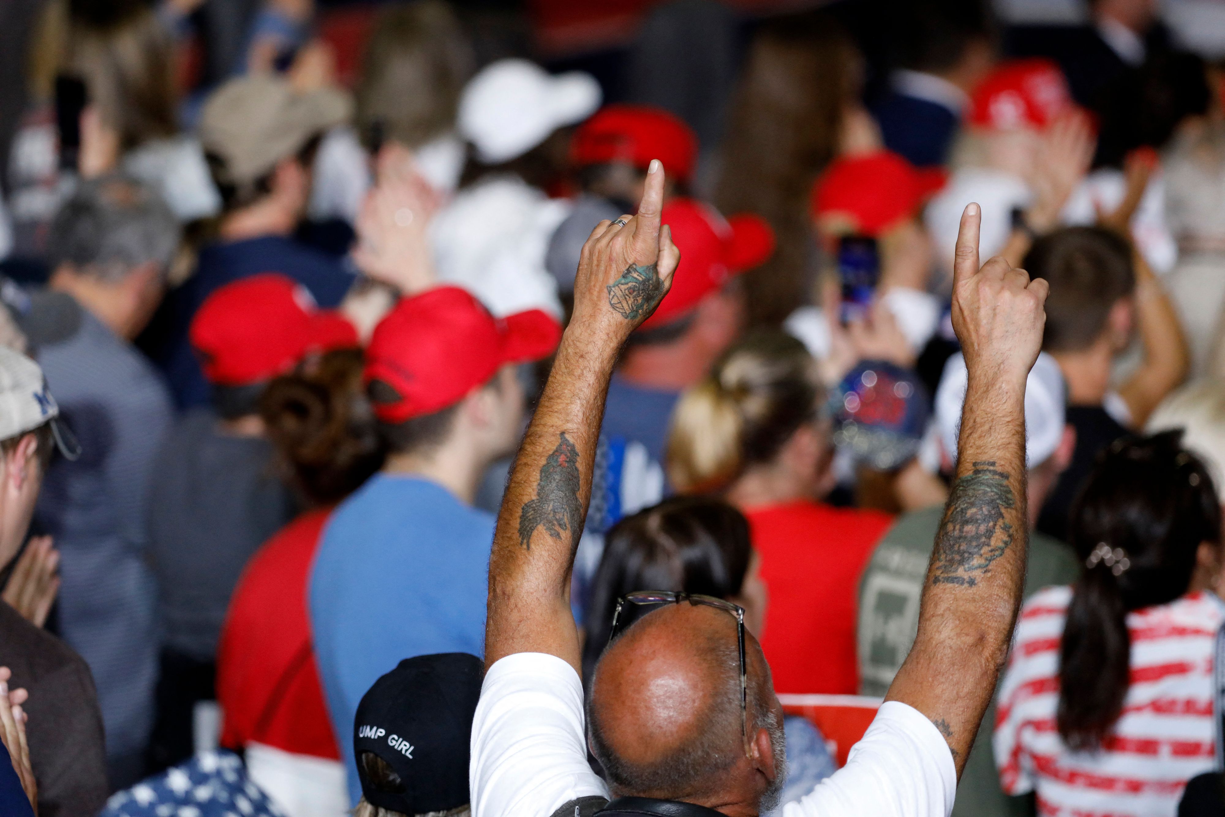 A spectator gives a QAnon salute at a 2022 Trump rally in Warren, Michigan.Jeff Kowalsky/AFP/Getty